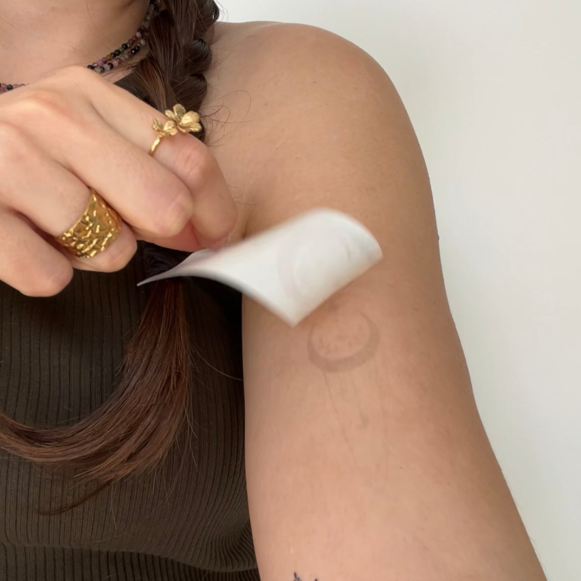 Het aanbrengen is eenvoudig: zorg ervoor dat je huid schoon en droog is, plaats de tattoo op het gewenste gebied en druk vervolgens een vochtig doekje ongeveer 30 seconden over de tattoo. Verwijder dan voorzichtig het papier om je tattoo te onthullen.
